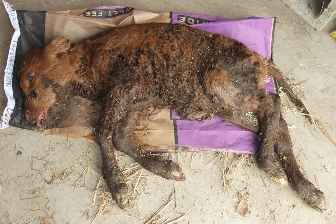 I went out to start my morning chores Thursday and after a visit to the hens, I heard Keira greeting me from behind the barn. I went through the parlor to check on her & was horrified by the sight that met my eyes when I opened the outside door. There stood a gaunt, forlorn Keira, looking like she had wallowed in the mud all night, cord hanging out and…….”Keira, where’s the baby?!?” I soon found him – a perfectly normal looking red bull calf, lying dead in the mud on the other side of the fence. Keira still had not milked up at all. A few hours later, she finally passed the placenta, along with a river of fluid.