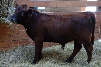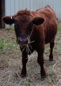We were impressed with Patrick from birth. He was structurally correct, and a nice stout, solid calf, with the wonderful disposition that Rousseau so faithfully passes on. He has grown into a handsome looking weanling who is quite the mellow boy. His dam is a wonderful Legend cow with a good strong udder & a sweet, friendly temperament.