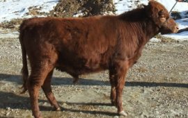 Little Man is maturing into a very fine looking young man while remaining quite short. He is a well-balanced bull, with a nice topline, good depth & rib spring, and great feet & legs. He has very nicely muscled hindqarters for a young bull, and yes, he really is only 41″ tall! Milkman is halter trained & very easy to handle.
