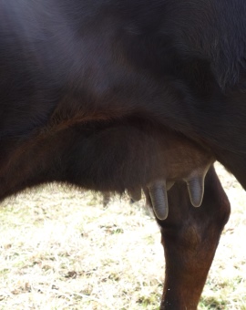 Timmie has had her first calf, and is being a wonderful momma. Her udder is lovely, with great attachments fore & rear and very nice teat spacing. She’s doing fairly well with her milking training & seems to have good production.