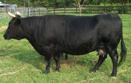 Sara is out of traditional Legacy bloodlines and her grandsire is the popular, high quality bull, Jamie O’Callen. Although her udder is a bit lacking, with a sloped floor and poor fore-udder & attachment, I really like Sara as she has a lot to offer. She has very nice conformation, with exceptional body length and depth, and great width and muscling…the stretch Hummer version of Dexter cows. She IS trained to milk, though, and does great with it – hand or machine, and I’m glad for the opportunity to milk her again this summer. All in all, she’s a decent little cow, and has produced some very nice calves.